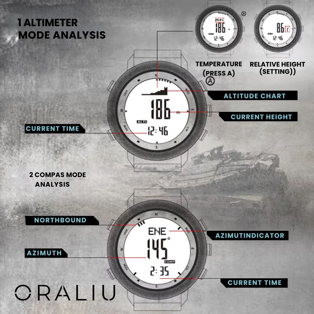 Erobre hvert sti, topp eller svømmedykk med denne robuste utendørs sportsklokken, designet for holdbarhet, presisjon og sanntids miljøovervåking. Vanntett opp til 50 meter og utstyrt med avanserte sensorer, er denne klokken det ultimate verktøyet for turgåere, klatrere, svømmere og eventyrere.