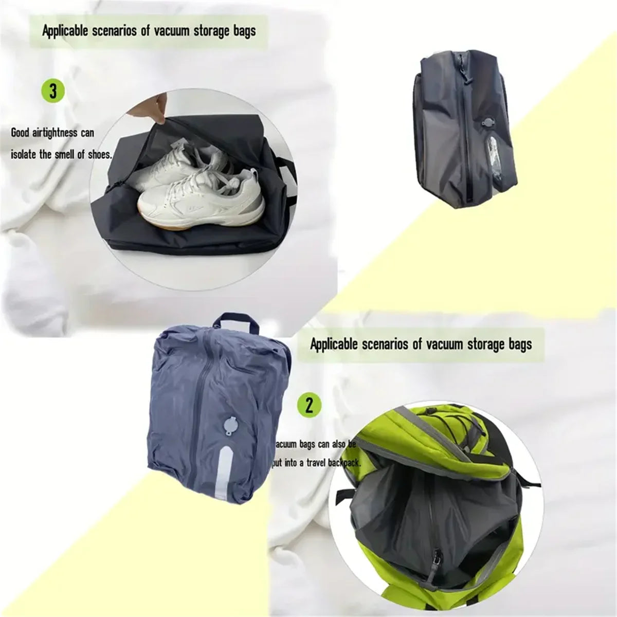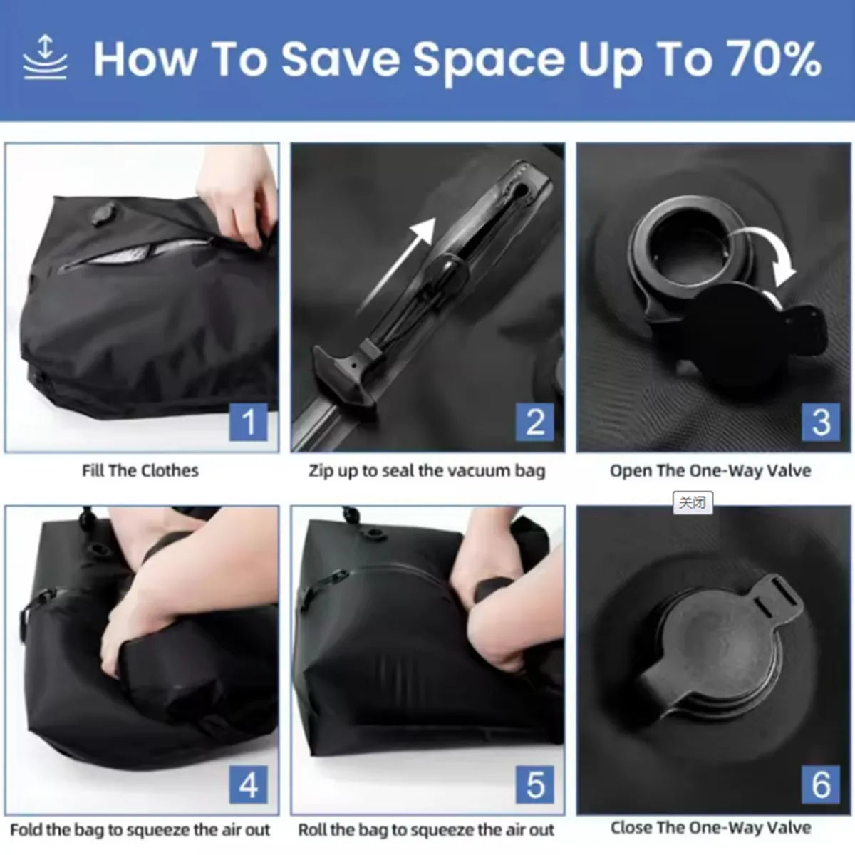 ● Optimal Bagasjeplass: Utformingen av reiseplassen reduserer avfall mellom de oppblåste vakuumposene. Dette maksimerer ikke bare bagasjeplassen, men gir også en ryddig organisering for andre reiseartikler.