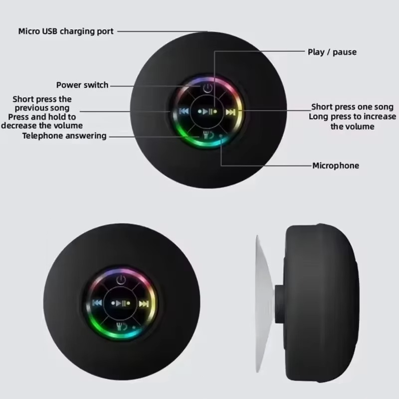 Med IPX4 vanntett sertifisering, LED-belysning som setter stemningen, og en stor sugekopp som gjør festing enkelt, er denne høyttaleren laget for å gi optimal bekvemmelighet og pålitelighet under varierte forhold.