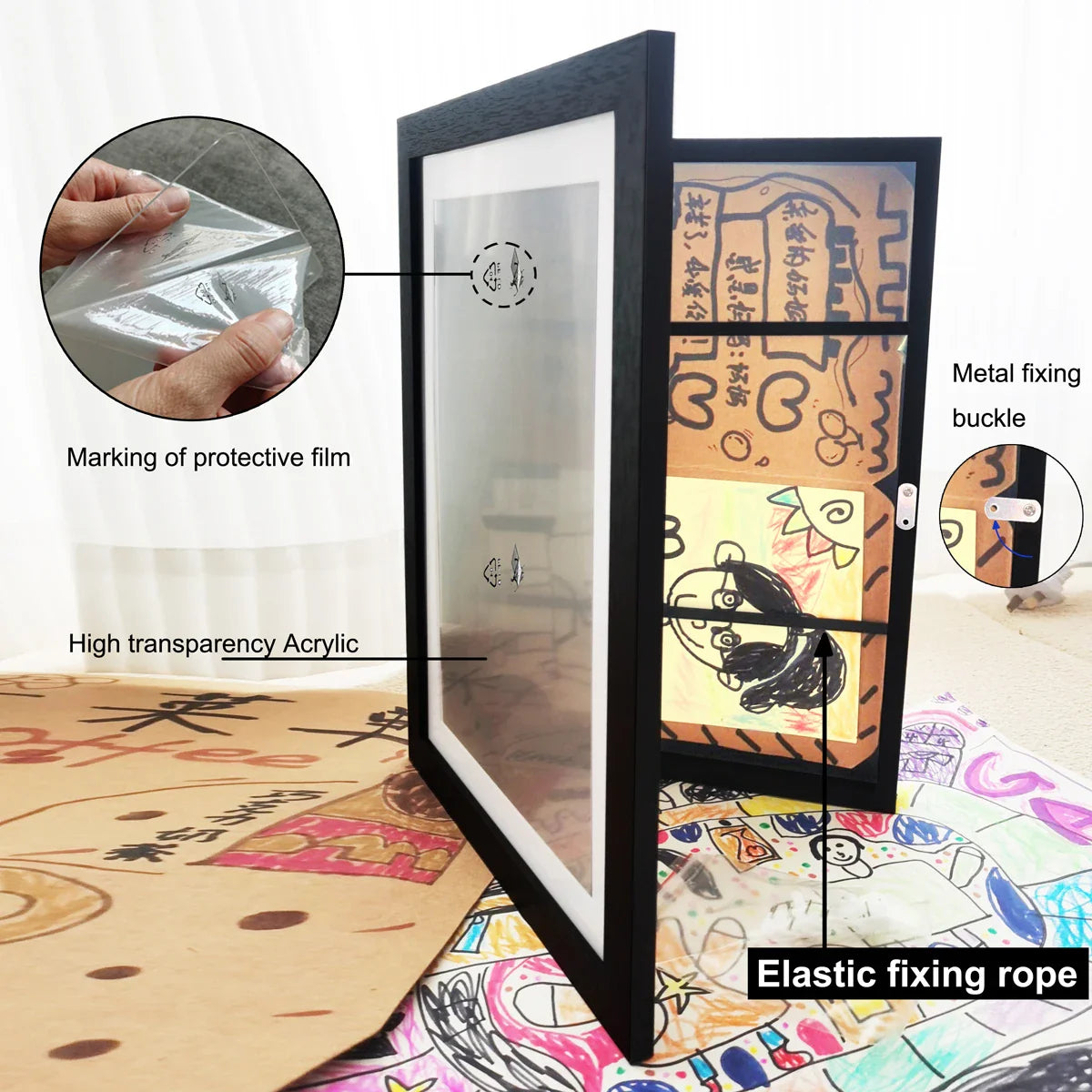 ● Design: Ideell for ditt barns kjære kunstverk; rammen åpnes som en bok og er utstyrt med elastiske stropper på innsiden for å oppbevare kunstverkene; den inkluderer en hvit skråkant samt hengemateriell for enkel opphenging både horisontalt og vertikalt mot veggen.