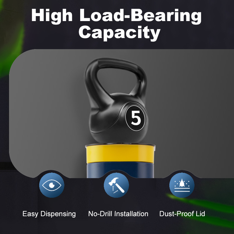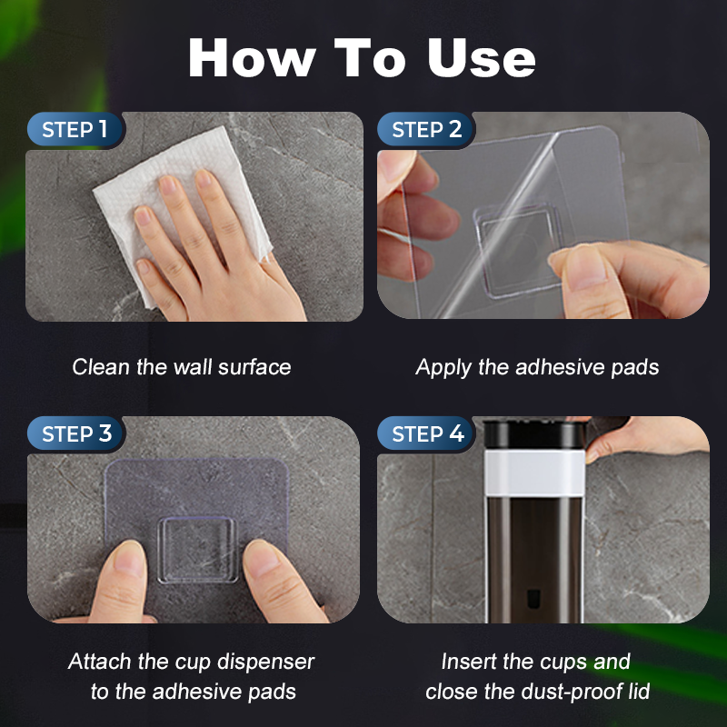 INSTALLASJON UTEN BORING - Installer enkelt med selvklebende puter uten boring, som festes sikkert til vegger eller glatte overflater uten å forårsake skade. Dispenseren kan monteres hvor som helst, og tilbyr en problemfri installasjonsprosess.