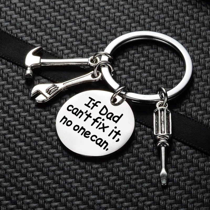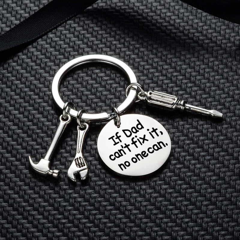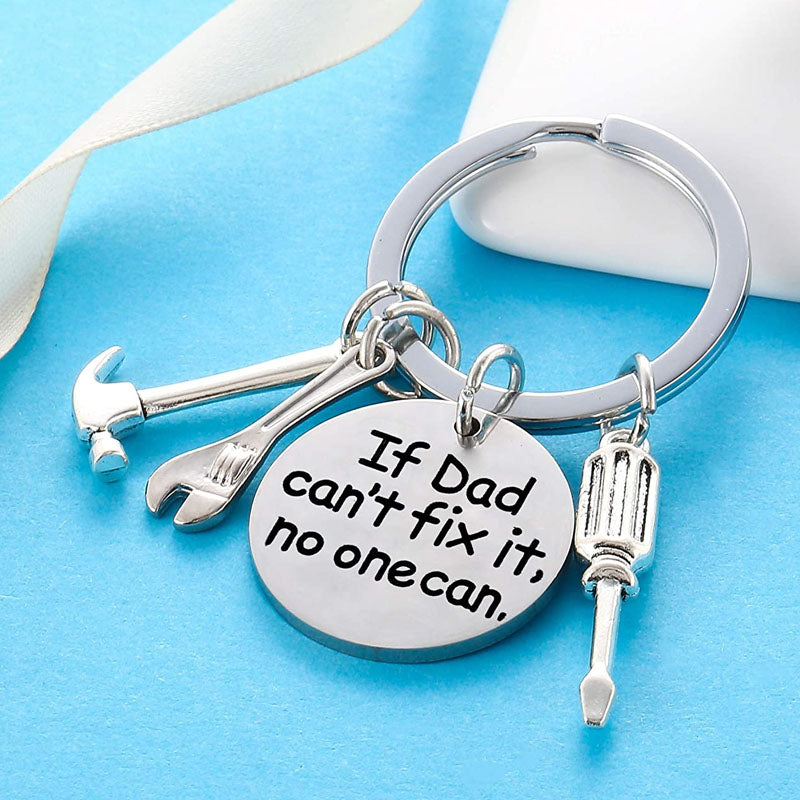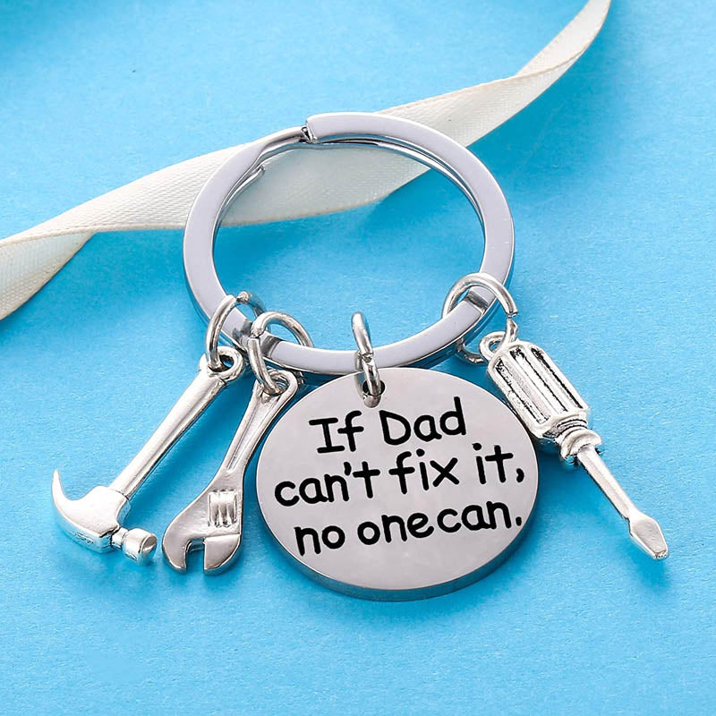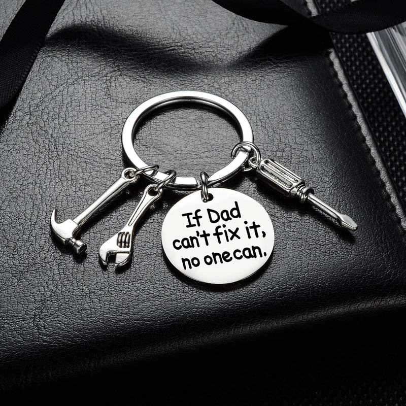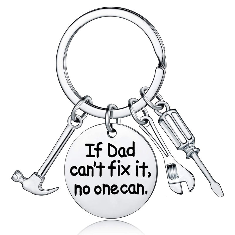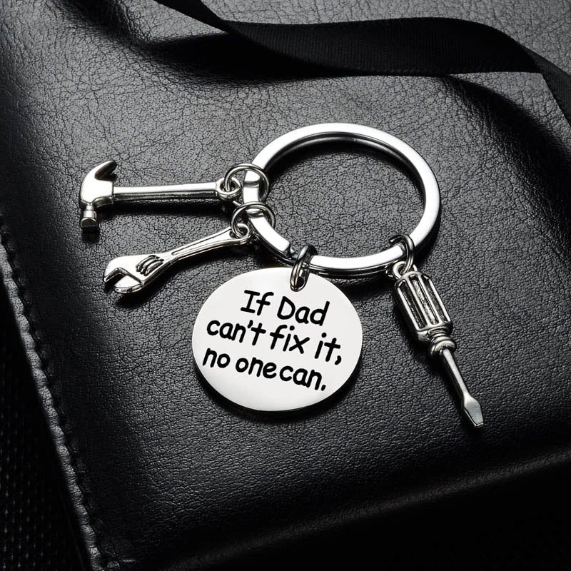 - Dette nøkkelefobene inkluderer morsomme verktøy-charmes, som en sjarmerende skrutrekker, en justerbar skiftenøkkel og en hammer, samt en charm med teksten: Hvis pappa ikke kan ordne det, kan ingen. Det er et humoristisk design som gjør det til en perfekt gave til fedre eller pappaer.