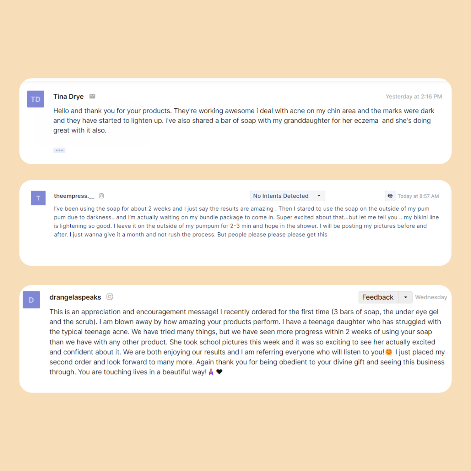 Etter to uker med bruk, la jeg merke til at mine mørke flekker ble lysere og jeg fikk færre utbrudd. Denne såpen har blitt en bærebjelke i min hudpleierutine!