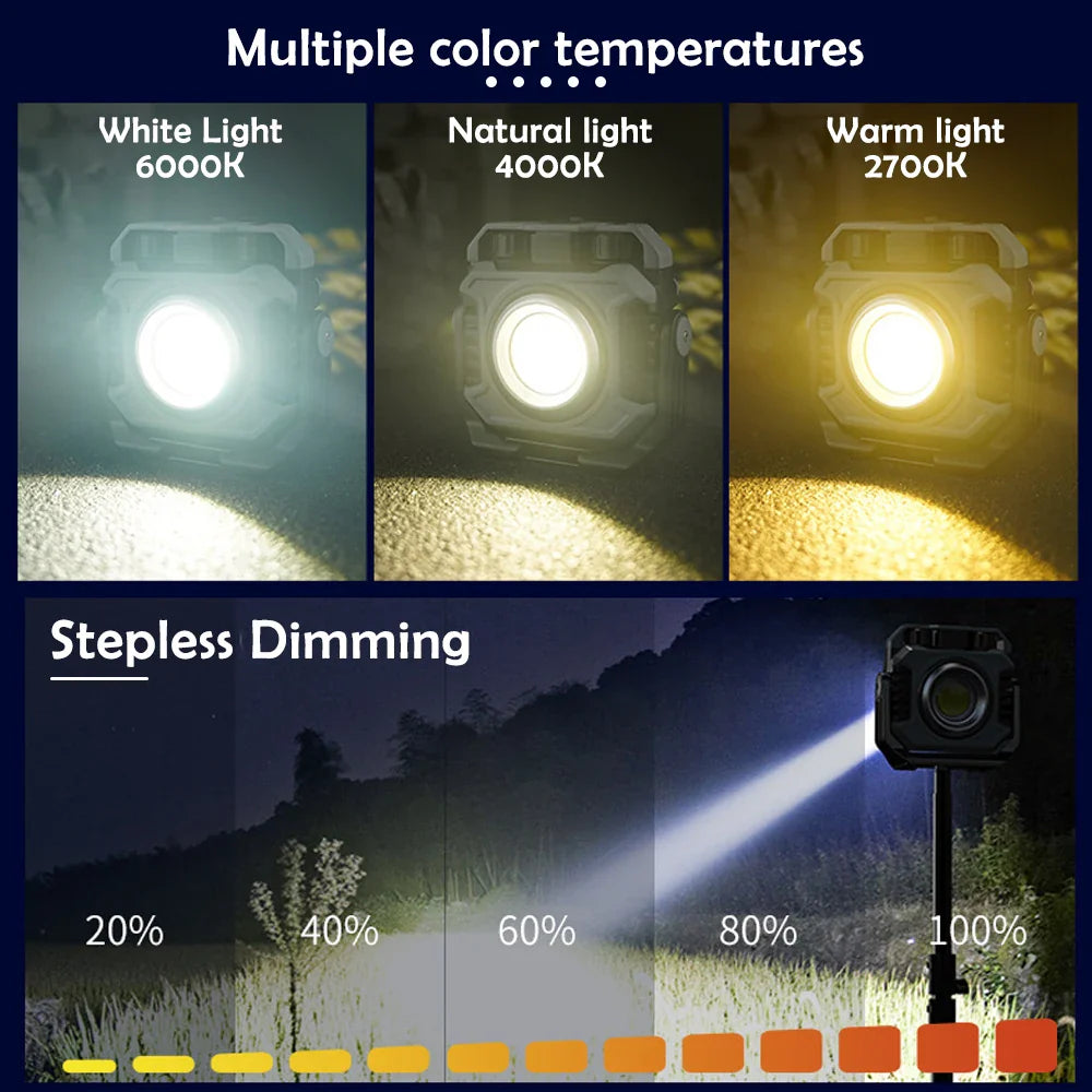 📌 Kraftfull dobbel belysning – 1500 lumen bred COB flomlys + 600 lumen fokusert TG3 spotlight: Trinnløs dimming, av/på-bryter, og tilpasset for enhver situasjon.
