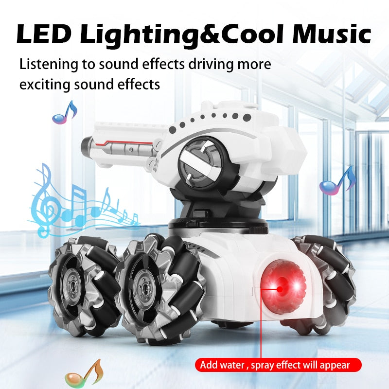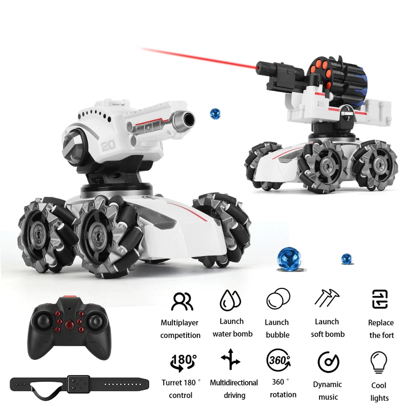 3-i-1 fjernkontrolltank som skyter, presis skyteutfordring, automatisk demonstrasjonsfunksjon, 180° kontrollrotasjon, kule lys og musikk, LED-lamper foran på bilen, det vil være en sprayeffekt når vann tilsettes for å gå, noe som gir spillerne mer moro. Disse pansrede kjøretøyene er laget av høy kvalitet ABS og elektroniske komponenter. Den har ultra-høy styrke, er robust og motstandsdyktig mot fall, og er holdbar til å håndtere ulike operasjoner. Dette er den perfekte gaven til barn!