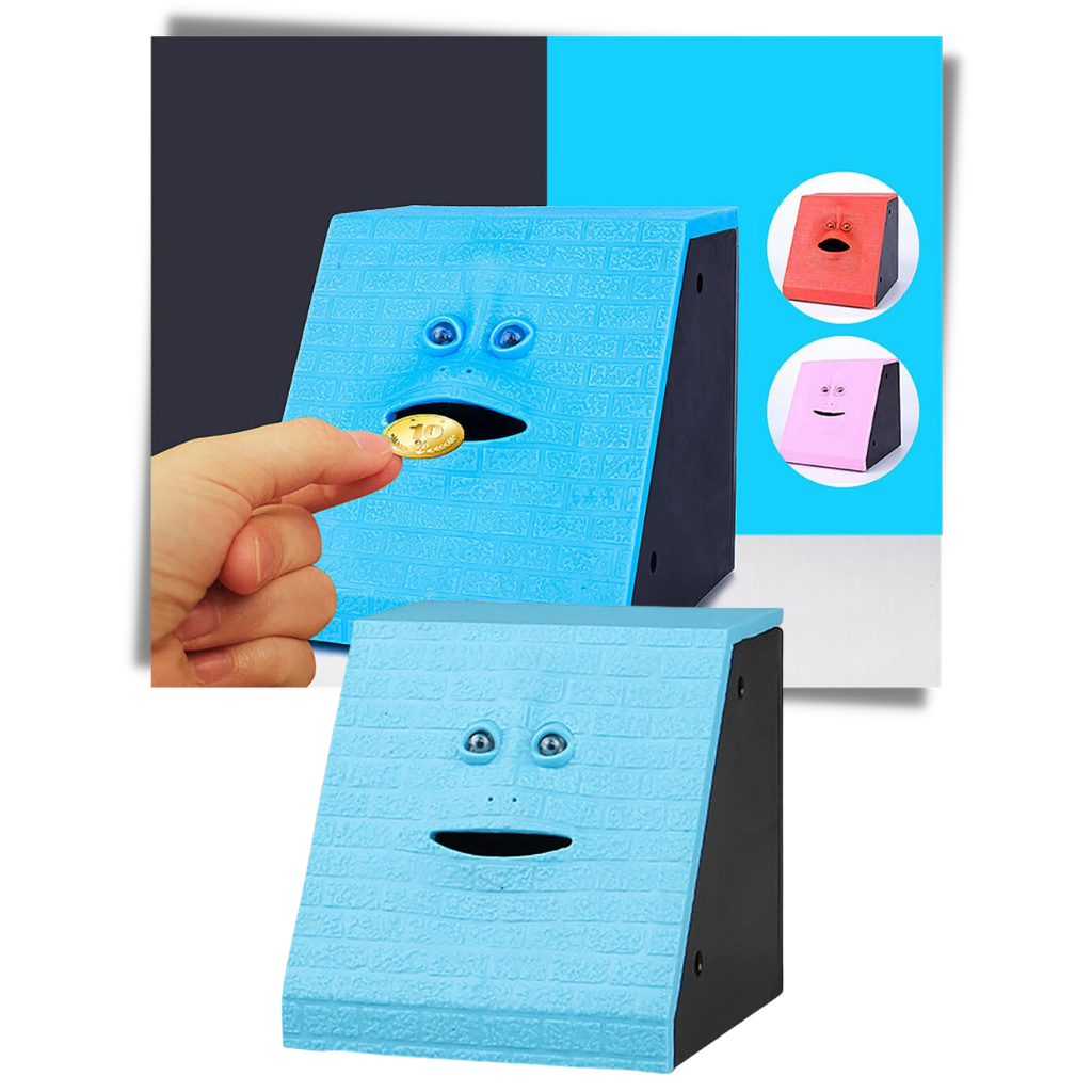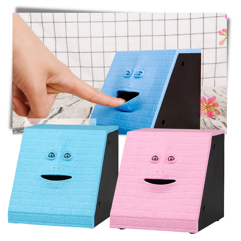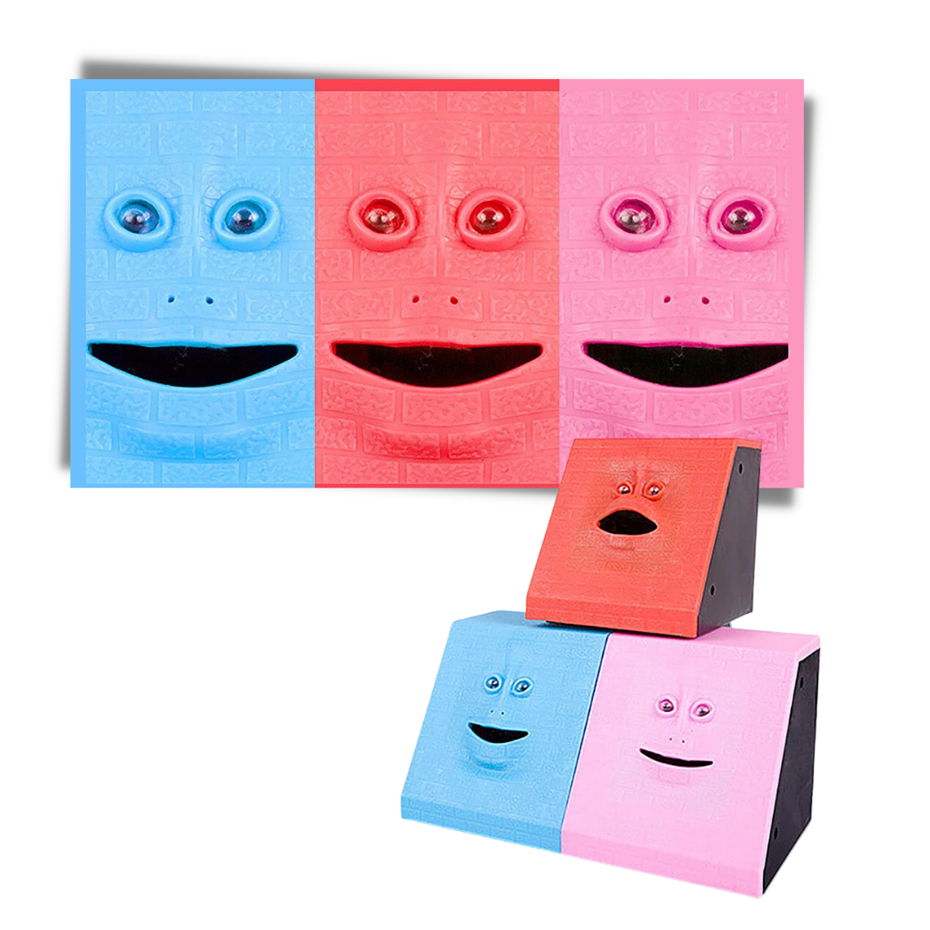 Ansiktet til denne pengespisende sparegrisen er laget av mykt og elastisk elastomermateriale. Overflateavtrykket er som murstein og sparegrisen har 4 sklisikre føtter på bunnen. Bevegelsene i ansiktet er så realistiske at det vil imponere og hypnotisere hvem som helst. På toppen av det hele er designet glatt og behagelig å ta på.
