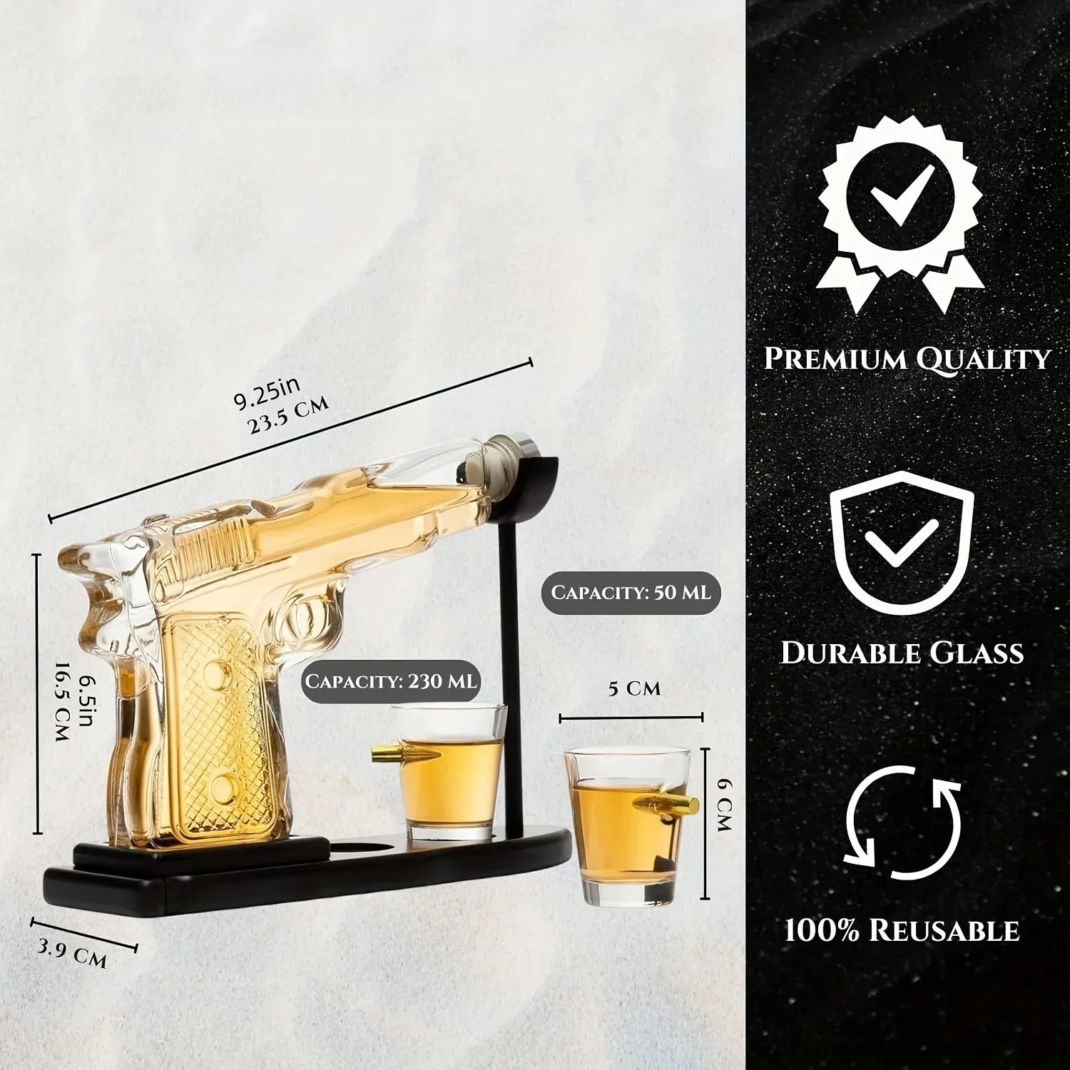 - Unik og Stilig Design: Den pistol-inspirerte dekanteren kombinert med kuleformede shot-glass skaper et iøynefallende midtpunkt.