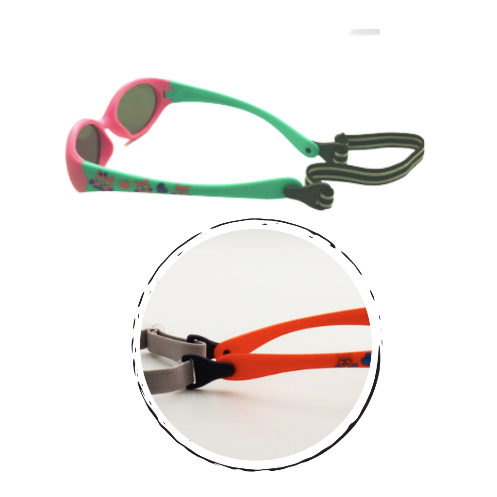 Disse søte solbrillene er egnet for babyer opptil 36 måneder og har et fleksibelt hodebånd for en sikrere passform. Båndet passer til en hodeomkrets som måler 33 til 38 cm og sitter tett uten å skade huden. De små solbrillene er designet for små ansikter og kommer med 40 mm x 35 mm glass og en nesebro på 16 mm som er stabil, myk og behagelig å ha på . Armen på 103 mm er laget av hudvennlig plast som ikke irriterer barnets hud. Barnesolbriller har også myke og sikre metallhengsler som sikrer smidig åpning og lukking ved tinningen.
