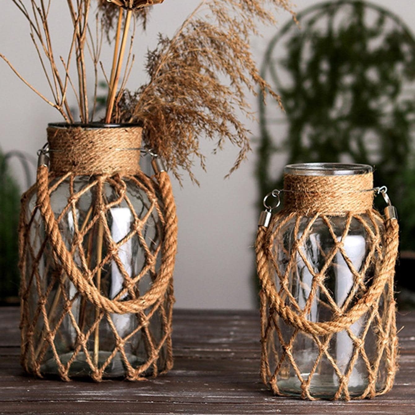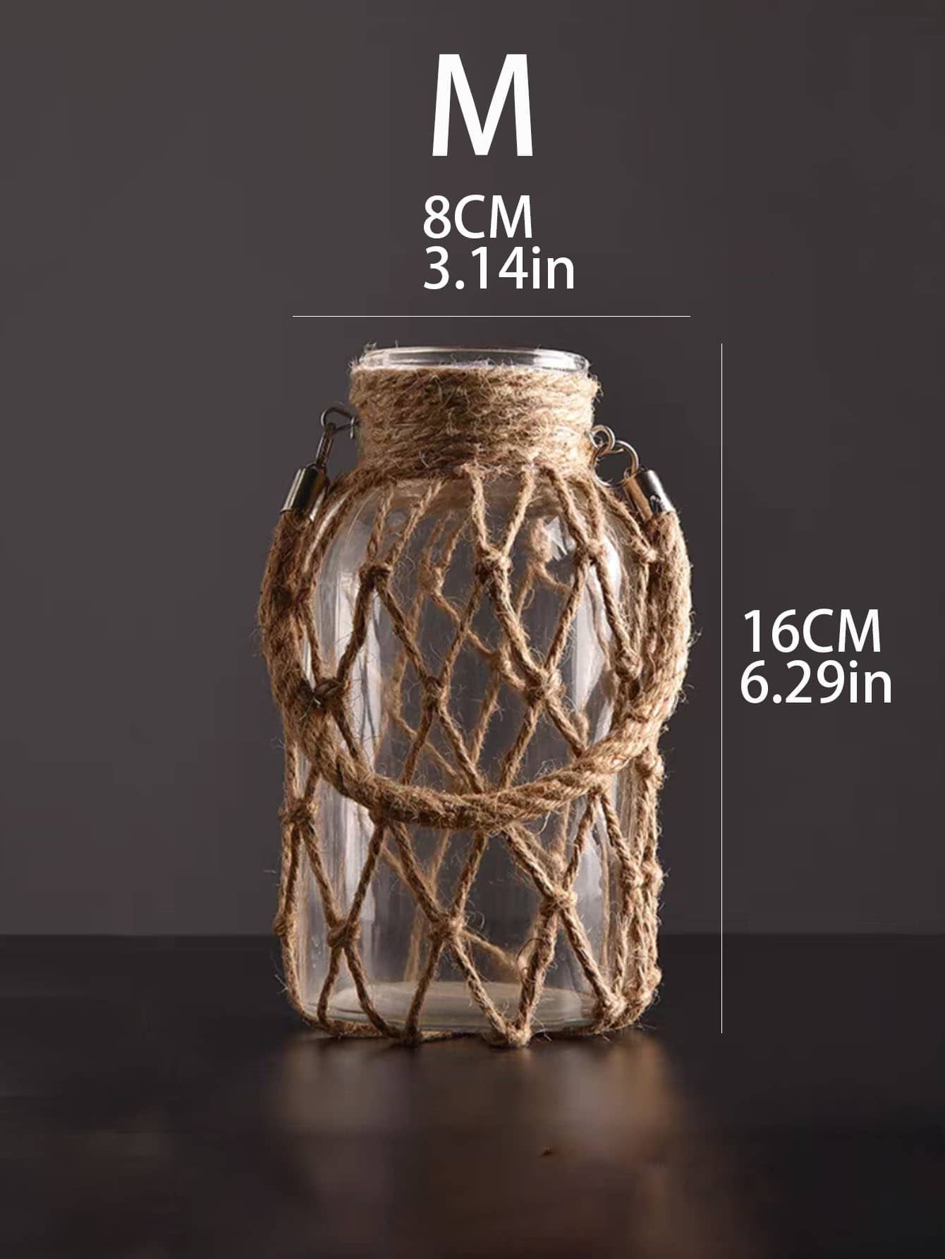 Enrich your home with these attractive hanging glass vases, featuring a refined rope mesh and durable hemp rope. Perfect for showcasing dried flowers, these vases add a touch of rustic elegance to any room or table setting. Thanks to their versatile style, they can be used both hanging and standing, making them a unique and creative addition to your home. Whether filled with fresh flowers or left empty, this vase truly elevates the beauty of any setting.