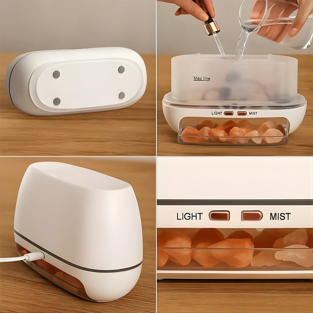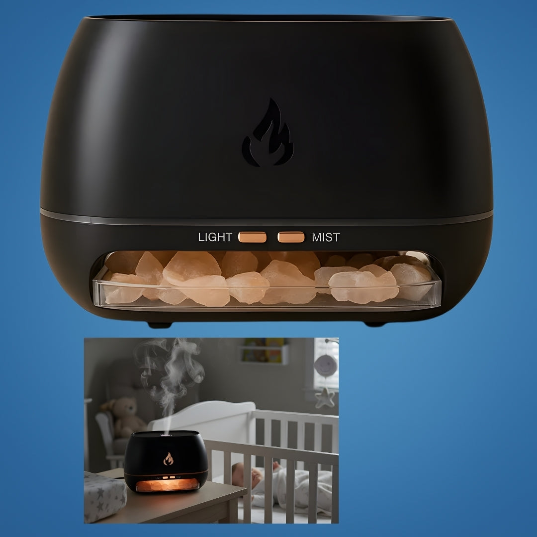 Med en naturlig base laget av Himalaya-saltkrystall, renser og revitaliserer SaltAura Luftfukter Diffuser omgivelsene dine, og reduserer tørke som oppstår fra oppvarming eller klimaanlegg. Dens lydløse drift gir uavbrutt komfort, mens flamme-effekt belysning tilfører en touch av ro til ethvert rom.