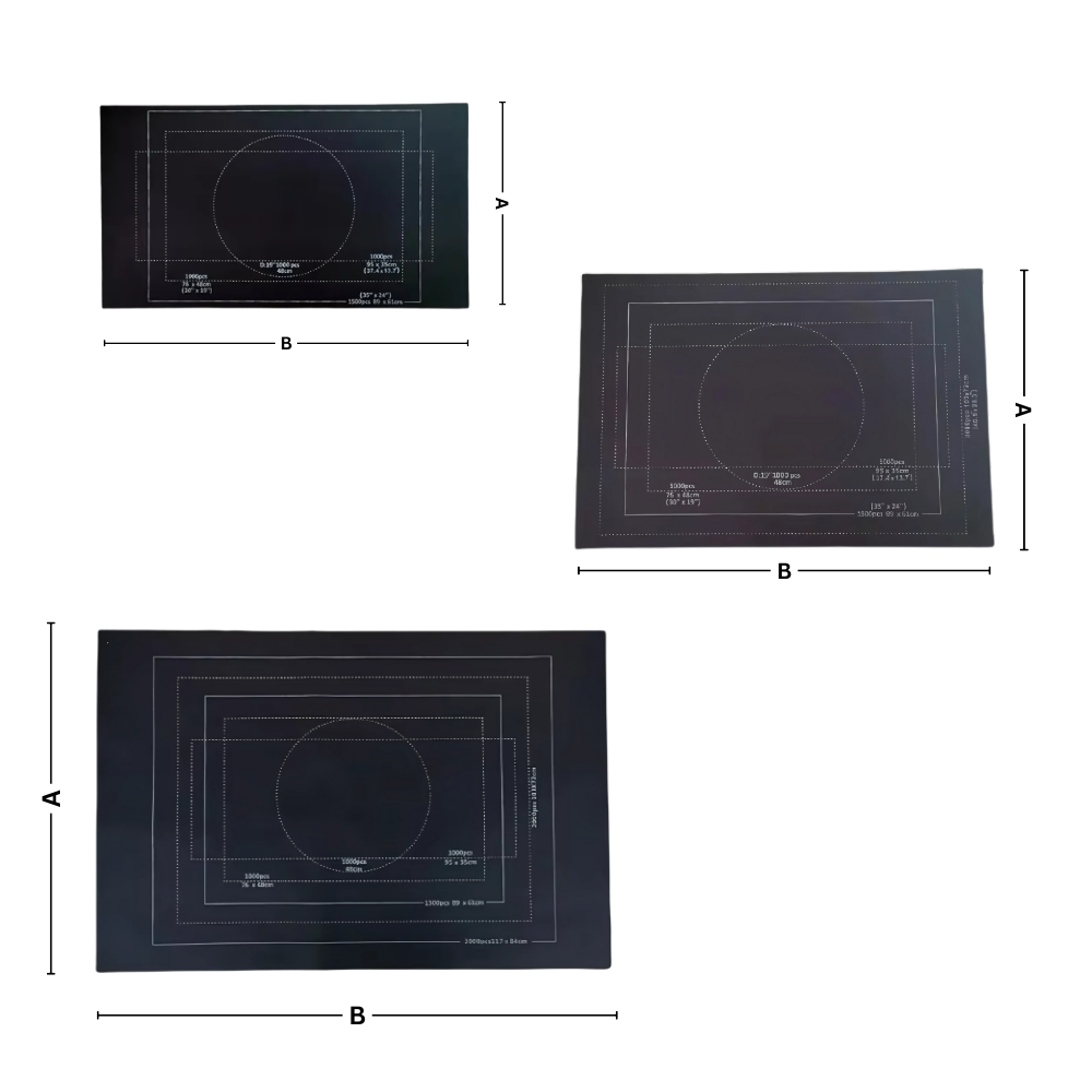 Dimensjoner: 1 500 stk - A x B = 65,99 x 105,31 cm / 25,98 x 41,46 tommer 2 000 stk - A x B = 80,01 x 118,01 cm / 31,50 x 46,46 tommer 3 000 stk - A x B = 100,0 x 150,01 cm / 39,37 x 59,06 tommer