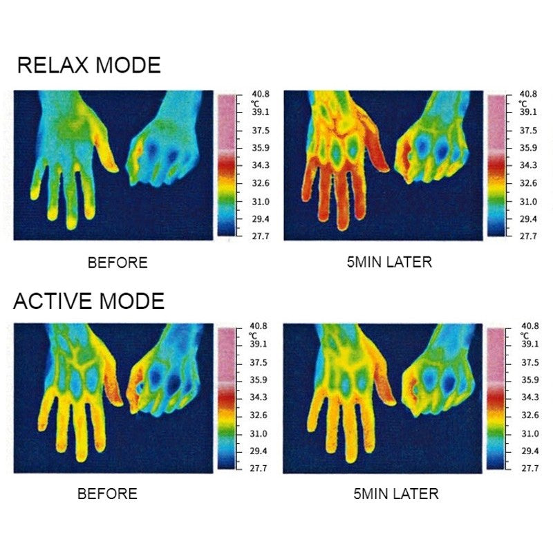I avslapningsmodus vil temperaturen på hånden stige etter fem minutters bruk; i avslapningsmodus vil temperaturen på hånden synke etter fem minutters bruk.