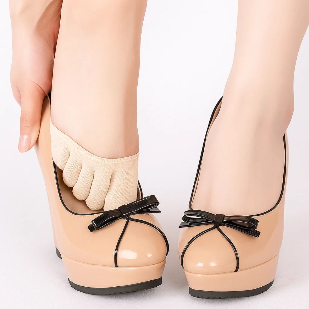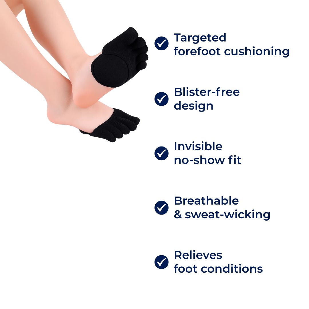 Utviklet med moderne teknologi, hindrer de blemmer, lindrer smerte fra Hallux Valgus og liktorn, samt demper støt med polstret forfotpadding. Det pustende, fukttransporterende materialet holder føttene kjølige og fri for lukt, mens den usynlige no-show designen integreres sømløst med enhver type fottøy.