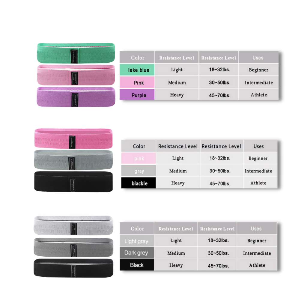 Motstandsbåndene er designet for å passe alle treningsbehov uansett nivå. Uansett om du er nybegynner, prøver å komme i form igjen eller proff. De er delt inn i 3 nivåer (lett, medium og høy) som kan brukes i henhold til øvelsen du gjør eller vanskelighetsgraden du leter etter. Det blå båndet er et lett bånd som kan støtte et motstandsnivå opp til 30 lbs. Det rosa opptil 50 lbs og det lilla (høye nivået) opp til 70 lbs. Det lille programmet som følger med i pakken, vil definitivt hjelpe deg med å tilpasse treningen din til de forskjellige nivåene.