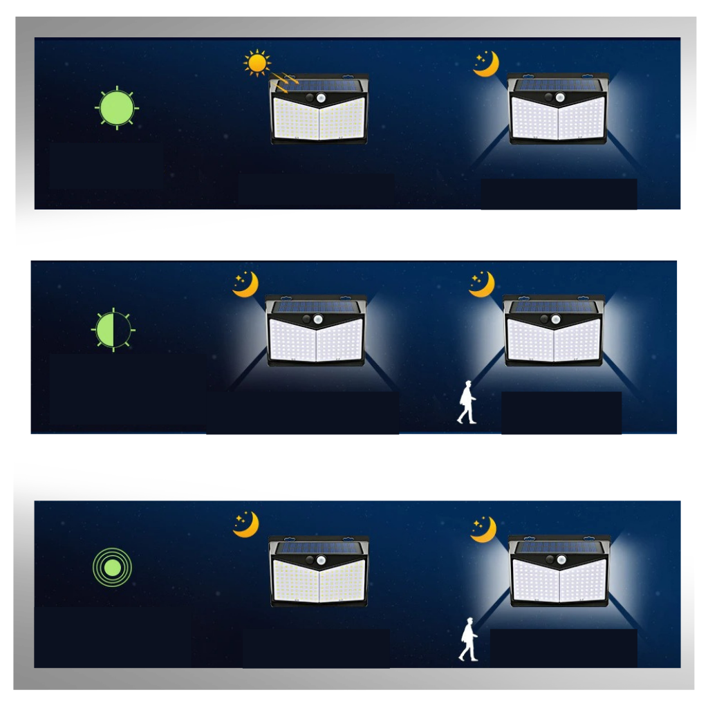 2. Modus for svakt sensorlys - Den slås automatisk på om natten og etterlater det opplyste området med et svakt lys når ingen er der. Når noen kommer inn i sensorområdet, vises det et sterkt lys.