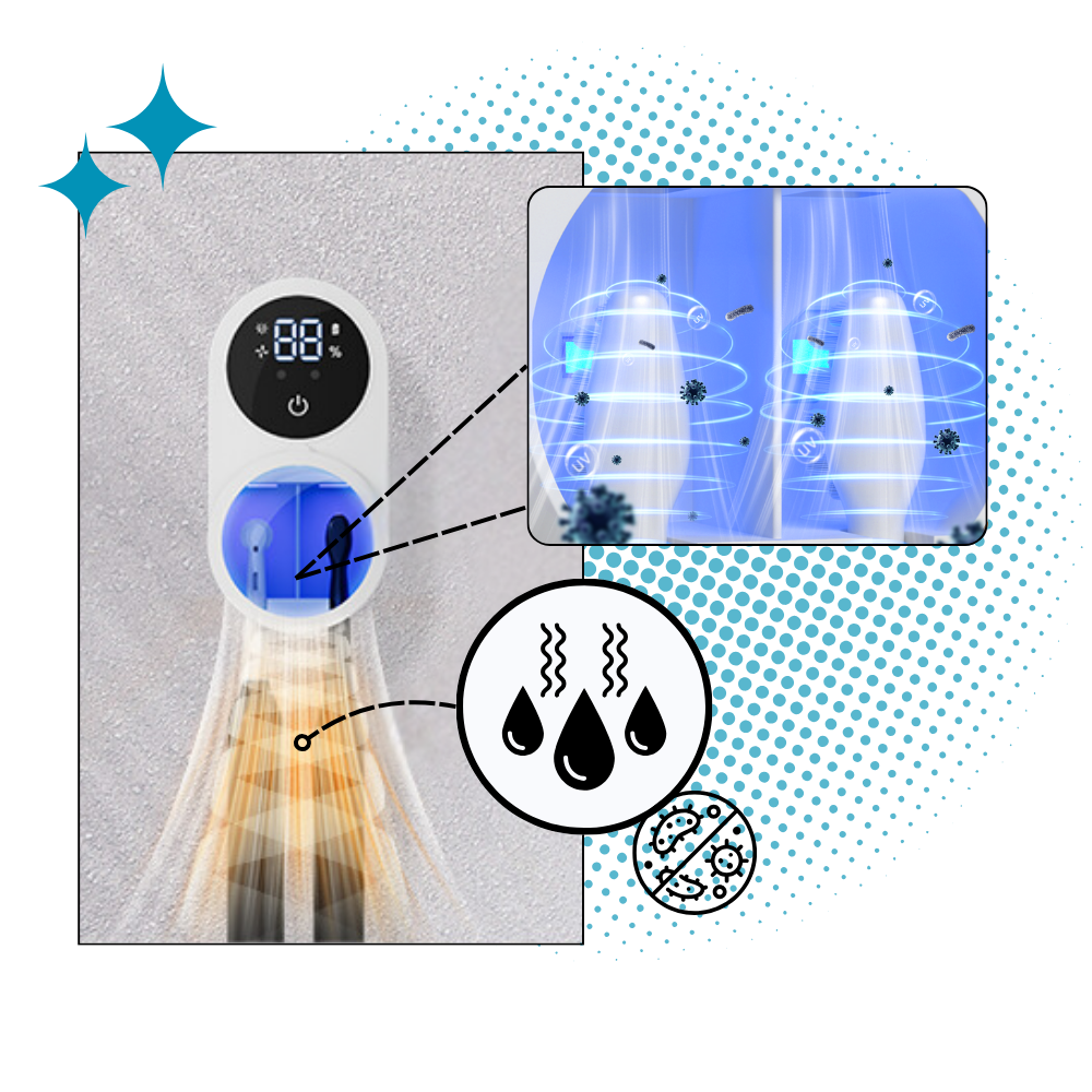 Å holde tannbørsten tørr er avgjørende for å unngå bakterievekst, og UV-desinfiserer til Tannbørste med Smart LED-Skjerm excellerer med sin sofistikerte lufttørkefunksjon. Dette automatiserte systemet fjerner effektivt fuktighet etter hver rengjøringssyklus. Ved å tørke bort fuktigheten, beskytter enheten ikke bare tannbørsten din mot skadelige bakterier, men forlenger også levetiden. Denne funksjonen gir deg trygghet til å oppbevare tannbørsten hygienisk ren og tørr.